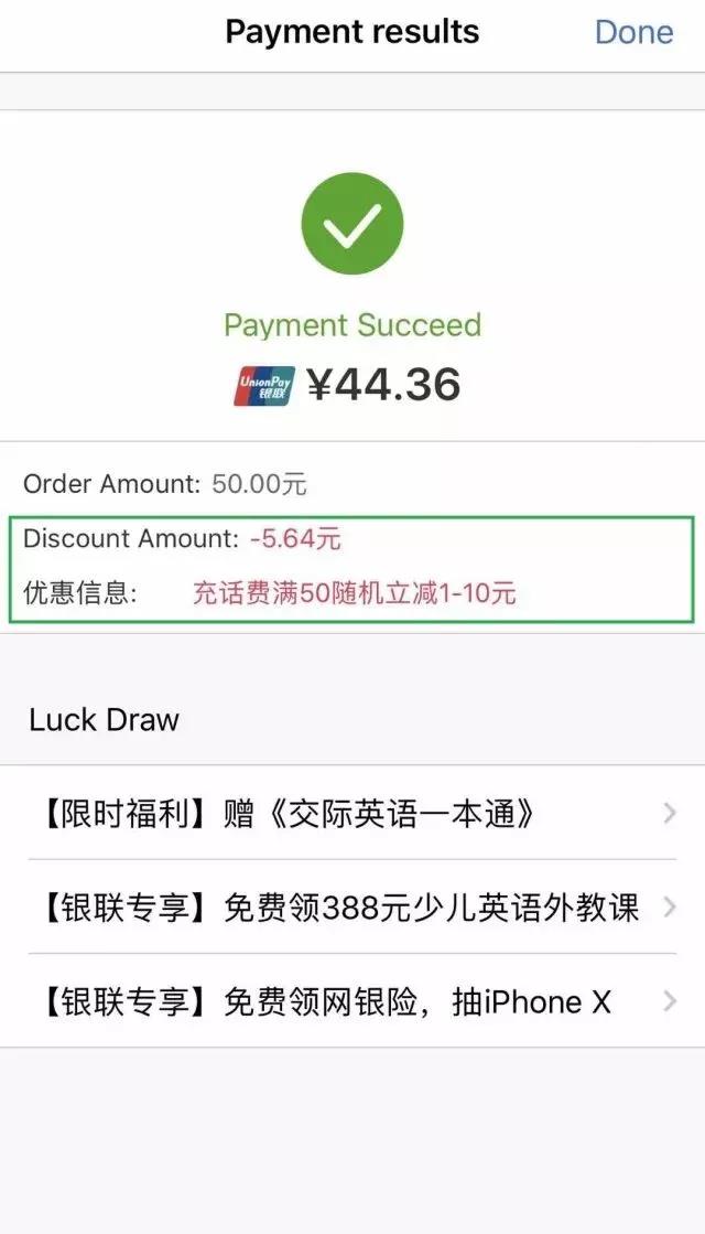 在云闪付APP内进行手机充值时选择【云闪付】付款 ,充值金额(非实付金额)满50元 ,即可享受随机立减1-10元优惠 。活动期间每日限量5万笔 ,单用户每自然月限享受1笔优惠 ,数量有限 ,先到先得 。